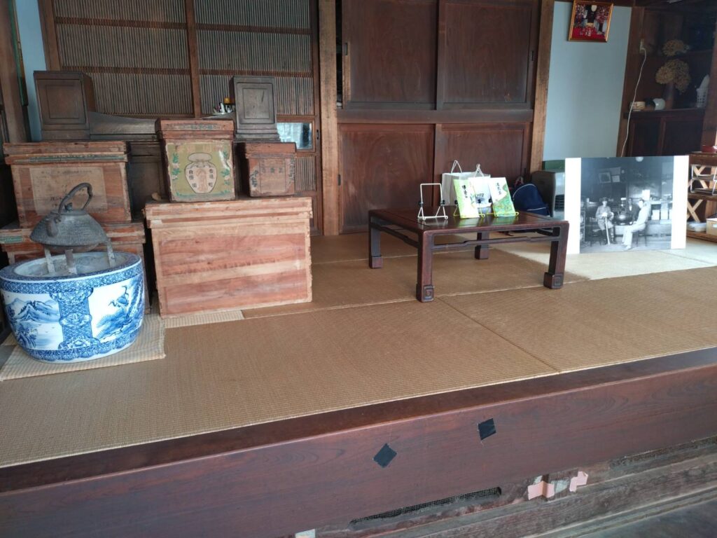 入間園だった当時の面影がわかるように畳の間に展示した茶箱や火鉢や机などの古道具